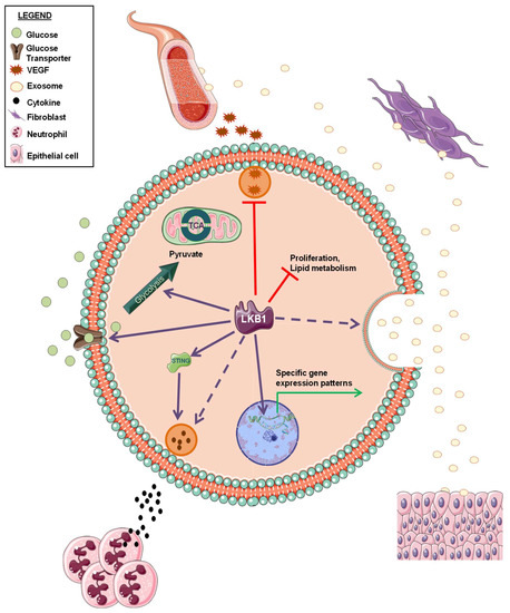 LKB1 is involved in many energy-related cellular processes. Besides its “classical” role as a regulator of fatty acid, cholesterol, and protein biosynthesis, the LKB1/AMPK axis is involved in the translocation of intracellular GLUT4 to the cell surface, therefore regulating glucose uptake and modulating glycolysis [4]. Enhanced turnover of macromolecules and organelles via autophagy to produce amino acids is another process that relies on LKB1–AMPK axis activity, and which takes part in cells’ response to nutrient starvation and bioenergetic stress [27]. Moreover, LKB1 is involved in the regulation of angiogenesis by modulating the expression of genes taking part in reactive oxygen species (ROS) homeostasis, such as NADPH oxidase 1 (NOX1) [28]. The connection between LKB1 and angiogenesis is witnessed also by its role in suppressing the expression of VEGF, bFGF, MMP-2, and MMP-9 [29]. Furthermore, LKB1 loss has been linked to induction of epithelial-to-mesenchymal transition (EMT) [30] through the regulation of cell polarity and motility, and the modulation of FAK phosphorylation and CDC42 activation [31].