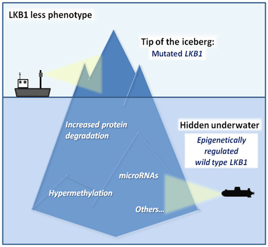 Schematic representation of the current knowledge on the LKB1less phenotype. The tip of the iceberg represents LKB1 mutations. Hidden underwater, the less investigated conditions that led to the LKB1less phenotype in wild-type LKB1 patients (hypermethylation of the promoter, non-coding RNAs, increased protein degradation, etc.) are waiting to be further investigated.