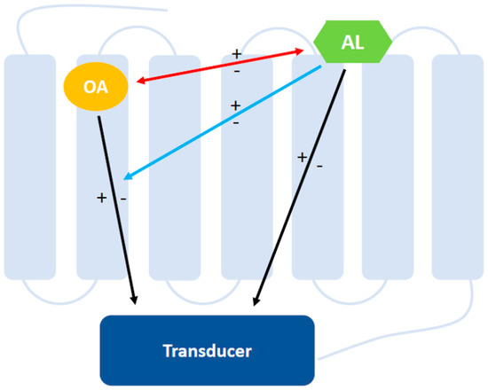 Allosteric modulation of class A G protein-coupled receptors (GPCRs). Orthosteric and allosteric binding sites are topographically distinct in the receptor protein. An allosteric ligand (AL) positively (+) or negatively (-) modulates the orthosteric agonist (OA) affinity (red arrow) and or efficacy (blue arrow) to the receptor. Moreover, allosteric modulators might have a direct agonist (+) or inverse agonist (-) effect on the receptor (black arrow) independent from the orthosteric ligand. The diagram was modified from Conn et al. (2009) [27].