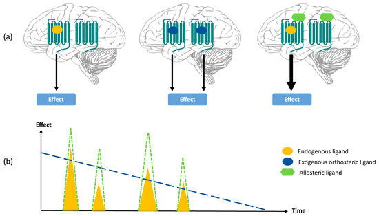 Spatial (a) and temporal (b) fidelity of positive allosteric modulation of the native orthosteric ligand. (a) Endogenous agonist (left panel) is released where it is necessary and activates the receptor in a specific area of the brain. Exogenous orthosteric agonist (middle panel) activates target receptors throughout the brain. Positive allosteric modulator (right panel) is distributed throughout the brain but modifies receptor activity only in the presence of the endogenous ligand, thus maintaining spatial fidelity. (b). Endogenous agonist (yellow triangles) is released and cleared quickly, leading to transient signaling effects. Exogenous orthosteric agonist (dashed blue line) occupies receptor persistently, leading to effects that last until the drug is cleared. Positive allosteric modulator (green dashed triangles) achieves physiological activity only when the endogenous agonist is released, thus maintaining temporal fidelity. Image (b) was modified from Burford et al. (2015) [39].