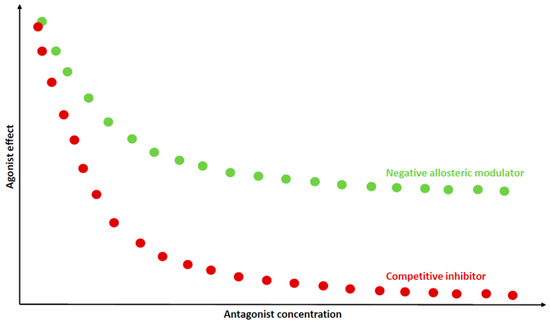 Ceiling effect of negative allosteric modulator. Increasing concentration of the competitive antagonist inhibits the effect of the endogenous agonist until the signaling is quenched (red dots). Increasing concentration of the negative allosteric modulator weakens the signal but does not extinguish it (green dots).