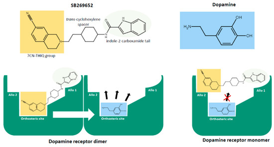 Hypothetical binding mode of SB269652 to dopamine receptor dimer and monomer. SB269652 is composed of three chemical parts, the 7CN-THIQ group, the trans-cyclohexylene spacer in the middle, and the indole-2-carboxamide tail. On the left, SB269652 binds in a bitopic mode to one protomer of the dopamine dimer, the 7CN-THIQ group to the orthosteric site and the indole-2-carboxamide group to the allosteric site (Allo1), to influence dopamine binding on the second protomer (black arrows) through an effect across the dimer (white arrow). On the right, SB269652 binds to the dopamine-occupied receptor and prevents agonist dissociation from the monomer (crossed black arrow). In this last configuration, the 7CN-THIQ group could engage an additional allosteric binding site (Allo2). Diagram was modified from Rossi et al. (2017) [14].