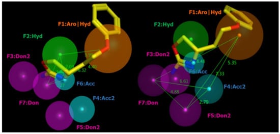 Indeed, for optimal PM mapping, the two hydrophobic rings should be folded towards each other, as exemplified by F1: Aro|Hyd and F2:Hyd, within a distance of 3.99 A. While F2:Hyd should be in the proximity of the H-bonding groups (2.09 A and 3.42 A, respectively) from the main F6:Acc and F7:Don moieties, the terminal aromatic ring F1:Aro|Hyd should be maintained at ideal distances of 4.40 A and 6.32 A from the aforementioned F6:Acc and F7: Don.
