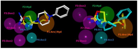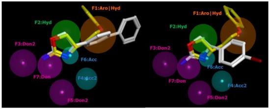 In particular, Figure 4 shows a bulky aromatic ring (namely F1 Aro|Hyd) properly connected to a further hydrophobic core (F2:Hyd) positioning H-bonding features (such as F3:Don2, F4:Acc2, F5:Don2) in proximity of the corresponding principal F6:Acc and F7:Don (shared by all the most potent oxazolines). Interestingly, this information agrees with our previous QSARs, supporting a limited number of positively charged atoms in TAAR1 ligands engaged in a salt bridge with a conserved aspartic acid (D103) of the receptor.