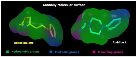 Compound 20b (pEC50 = 8.05)—chosen as representative oxazoline—fulfills these requirements, through the primary amine group, the oxazoline ring and the terminal phenyl ring, which proved to be properly folded thanks to the presence of the ethoxy chain (Figure 6).