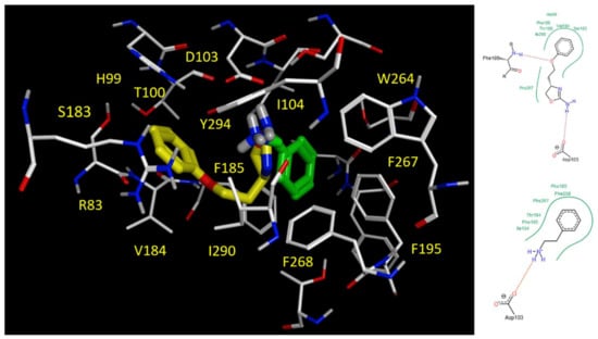 Moreover, the amidine moiety was H-bonded to D103 and I290, therefore being stabilized within the receptor cavity. Notably, the discussed docking mode of compound 1 was quite comparable with that of β-PEA, with the exception of π–π stacking with F267 and F268, due to the rigid piperazine in place of the flexible ethyl chain (Figure 12). These findings are in agreement with the higher pEC50 values of the endogenous trace amine β-PEA (pEC50 = 6.70 M) in comparison with that of the amidine derivative 1. A different point of view for the discussed docking poses is reported in Figure S3.
