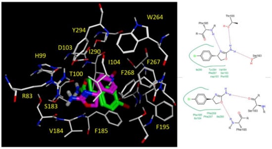 Contextually, the alkyl chain and the terminal phenyl ring are engaged in van der Waals contacts and π–π stacking with the side chains of V184, I290 and F185, respectively. A different point of view for the discussed docking poses is reported in Figure S1.