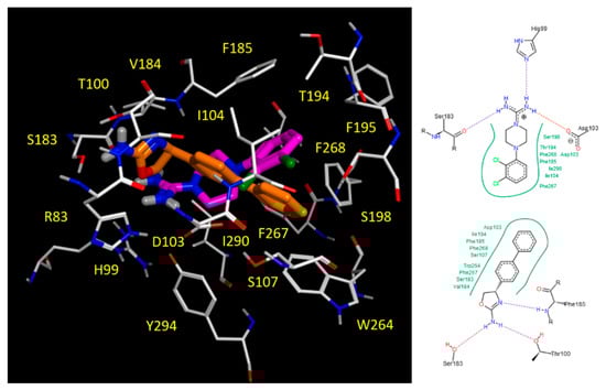Concerning the newly developed amidine-containing derivatives, both the prototype 1 and the most promising derivative 15 slightly shift their position within the protein cavity, bringing the amidine moiety into the proximity of the receptor residues H99 and D103, thereby engaging their side chains in H-bond contacts (Figure 12 and Figure 13). Moreover, the folded piperazine, in tandem with the presence of substituents at the phenyl ring, guides the aromatic core and the amidine moiety towards the hydrophobic cavity delimited by I104, V184, F185, W264, I290.