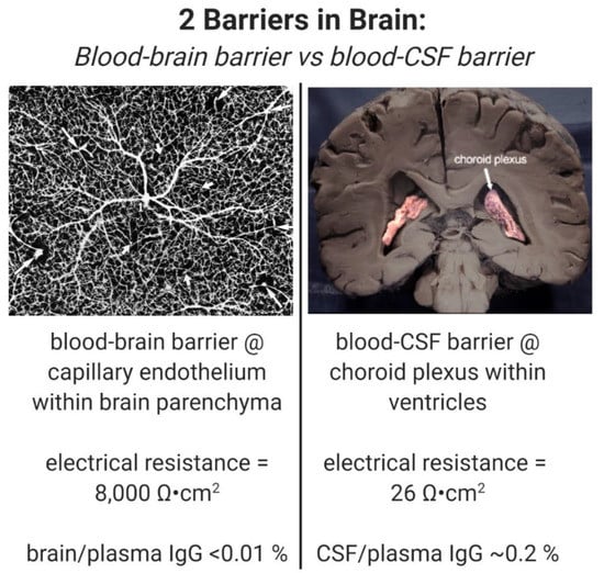 (left) Blood–brain barrier (BBB) is formed by the brain capillary endothelium which perfuse brain parenchyma, as shown in this inverted India ink study of the human cerebral cortex, which is adapted from [19] with permission. The BBB at the brain microvasculature is a very tight membrane barrier with an electrical resistance of ~8000 ohm·cm2 [11]. Owing to this tight barrier, IgG molecules do not cross the BBB, and the brain/plasma ratio of IgG is <0.01% [8]. (right) The blood–cerebrospinal fluid (CSF) barrier is formed at the choroid plexus lining the 4 cerebral ventricles, which include the 2 lateral ventricles shown here with pink coloration [20], and the third and fourth ventricles. Relative to the BBB, the choroid plexus is a leaky barrier with an electrical resistance of only 26 ohm·cm2 [10]. IgG molecules in plasma cross the leaky choroid plexus barrier and the CSF/plasma ratio of IgG is ~0.2% [12]. Image created with Biorender.com.