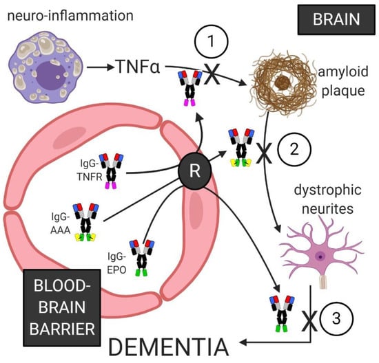 Blood-borne IgG fusion proteins penetrate the BBB via transport on a brain capillary endothelial receptor (R). An IgG-TNFR fusion protein sequesters TNFα to suppress neuro-inflammation. An IgG-AAA fusion protein disaggregates amyloid-beta plaque. An IgG-EPO fusion protein activates the neuronal EPOR to induce repair of dystrophic neurites, which leads to resolution of the dementia of AD. TNFR: tumor necrosis factor receptor; AAA: anti-Abeta antibody; EPO: erythropoietin. Image created with Biorender.com.