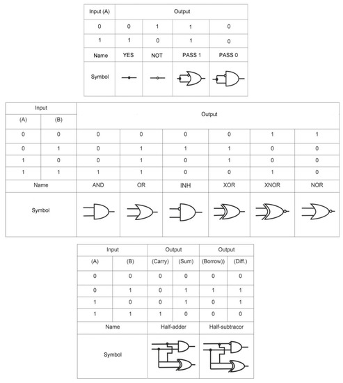 By definition, a logic gate is a basic element of a digital circuit that performs an elementary conversion of input signals into a logic output signal. In binary logic, these are binary switchers that have input conditions (0 or 1) that determine the output state (0 or 1). Figure 1 is considered a set of basic logic gates using Boolean computation and performing a set of operations via silicon computer. By analogy, these operations can be extended to bio-computing with the participation of aptamers.
