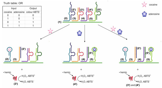 Logic gates OR, AND and XOR based on four DNAs located next to one another and partially hybridized on a common DNA substrate were compiled [58]. The two external DNAs are responsible for target recognition (2 and 5 on the Figure 2) and contain the aptamer sequence, while they are blocked by complementary mediator sequences, 2′ and 5′, correspondingly. Two internal DNAs (3 and 4) are blocked by sequences (3′ and 4′) containing an as-yet inactive DNAzyme catalyzing a peroxidase-like reaction. Mediator sequences (2′ and 5′ in Figure 2) are complimentary to internal DNAs 3 and 4. When a target appears in the system, the corresponding aptamer forms a complex with it. This results in the translocation of the blocking mediator DNA to the adjacent internal DNA with a blocked complementary DNAzyme sequence. During the strand displacement, which starts with the base pairing of the mediator sequences 2′, 5′ and internal DNAs 3 and 4 in the loop region of the duplexes (3/3′ and 4/4′ in Figure 2), DNAzymes 3′ and 4′ are released and duplexes of translocated mediator DNAs and internal DNAs are formed. The liberated DNAzyme forms a complex with hemin and catalyzes the colorimetric oxidation reaction of ABTS (2,2-azino-bis(3-ethylbenzothiazoline-6-sulfonic acid) disodium salt), which serves as the output signal of the system. Targets were used as input data: cocaine and adenosine monophosphate. Accordingly, each external DNA contained an aptamer for one of the targets. The OR logic is implemented when each target results in the release of active DNAzyme (signal timing). The AND logic is formed when each of the targets leads to the release of a part of the DNAzyme; therefore, the pushing DNAzyme is formed only in the presence of both targets. The XOR logic is implemented when each target releases an active DNAzyme, but when released together, the DNAzymes hybridize with each other and become inactive. The incubation time with the targets was 20 min; the time for monitoring the DNAzyme reaction was 2 min. In addition to aptamers, the use of DNA has also been shown as input. In one case, the use of ssDNA as input resulted in the release of the aptamer for thrombin and blocking of its protease activity. In general, the logic system is constructed using a modular design, which allows it to be adapted to various input and output sequences. In this case, the translation of information from one DNA to another is possible. The advantage of the system is that the output response does not go directly but is the result of a DNA cascade: the product of a higher level is activated by a lower one. The disadvantages are that the designed valves are disposable. Also, to implement the logic, high concentrations of targets were used, 1.25 × 10−4 M each, and a high ionic strength of solutions (400 mM NaCl). When using the data in the article, it is also worth paying attention to the correctness of the indicated sequences, since sequences 4 and 5, according to those indicated in the article, are hybridized to one fragment of the substrate, which is most likely an error.