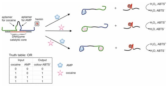 The use of two aptamers in one DNA sequence has been shown in [65]. This sequence is referred to as a bifunctional aptamer that contains the aptamer to cocaine at one end [50], and at the other end the aptamer to AMP [48]. Targets were used as inputs to the OR logic: cocaine and AMP. The essence of the approach was that the bifunctional aptamer was hybridized with ssDNA to form two duplex fragments and was in a blocked state (Figure 3). The formation of an incomplete duplex with the blocking DNA is due to the fact that in the case of interaction of the aptamer with one of the targets, dehybridization becomes energetically more preferable than in the case of complete hybridization of the sequences. The design of complementary regions is very important, because due to the energy balance between hybridization and dehybridization, the logic of the system is carried out directly: the output signal is 0 and 1. As a result, the blocked bifunctional aptamer dissociated from the blocking DNA in the presence of one or two targets simultaneously. In this case, the colorimetric peroxidase-like reaction of DNAzyme served as the output signal. The input sensitivity in this system was 5 × 10−6 M for cocaine and 1 × 10−5 M for AMP. The system output signal was formed within 62 min: 60 min of incubation with targets and 2 min of colorimetric measurement. In the second case, the separation of aptamers from the blocking DNA was detected by impedance spectroscopy, and the change in the resistance of interfacial electron transfer on the electrode surface served as the output signal. In this case, the blocking DNA was immobilized on gold electrodes. The sensitivity of this method of generating the output signal was the same as the previous one. In the third case, the blocking sequence was immobilized on the surface of an ion-sensitive field-effect transistor. Dehybridization of the aptamer with the target from the surface led to a change in the potential of the second source, which was reflected in the change in the potential of the second source. The output signal of the logic in this case was the gate-source potential, which assumed a constant value after 15 min. On the one hand, the use of bifunctional aptamers is an interesting solution, especially when introducing logical operations into sensing, when several markers are important for diagnosis simultaneously: their joint presence or the presence of at least one. Also, many known aptamers in combination with DNAzymes will make it possible to create various logical operations, including cascades. At the same time, bound aptamers can impact on each other (conformationally or partially complementary), as a result of which the efficiency of their interaction with targets can deteriorate. In addition, at this stage, the approach does not accurately identify the connection that triggers the response.