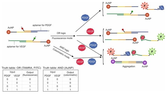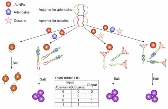 The former is more commonly used and is more universal; however, it is time-consuming and requires complicated modification procedures [88]. In this case, nanoparticles are covalently modified by aptamers, and logic inputs are usually aptamer targets. The latter case is not as common and is more rare, and it is based on physical sorption of ssDNA (aptamers) onto AuNP surface, which prevents their aggregation by electrostatic repulsion after salt addition. When an aptamer–target complex is forming, it causes formation of a rigid DNA structure which cannot be sorbed onto particle surface [55,71]; also, sorbed aptamers can desorb during target addition [41,42]. As a result, particles aggregation occurs after salt addition. Input data in unmodified particles logic are usually targets and aptamers.