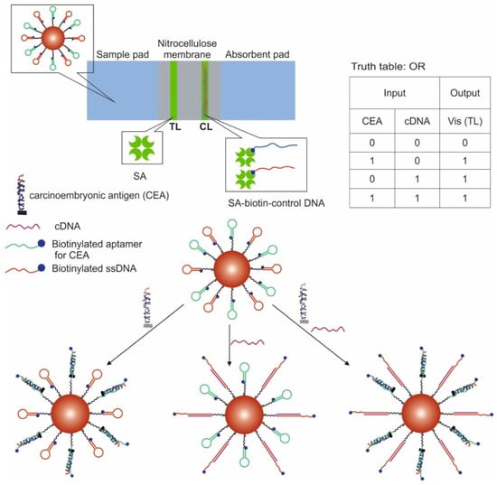 A separate direction of research is the development of lateral flow strip biosensors [54,68,69] and logic gates based on them. In this case, modified AuNPs cause the generation of output signals, which is the coloration of test areas, visible by the naked eye. This approach is fast and simple at the starting point of a logic operation.