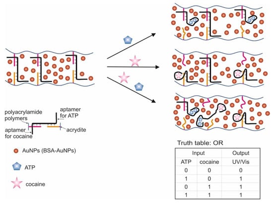 Gold nanoparticles (AuNPs) are used in the construction of aptamer-based logical operations due to the fact of their unique properties: surface plasmon resonance (SPR) [87], which is dependent on size and the distance between the particles, high molar extinction coefficient and highly efficient quenching of various fluorophores [74]. Taken together, these properties lead to a possibility of a fast, sensitive, and visual on-the-spot analysis.