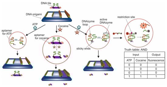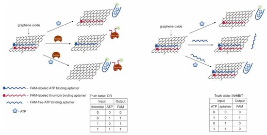 According to the analysis of the literature, it can be concluded that the existing logic gates based on aptamers can be divided into two categories. The first category is those that use a set of targets, the analysis of which is of practical importance; in other words, aptamer targets are found in the same environment. In this case, cell membrane markers and proteins [32,33,34,35,36,37,38,39,40], enantiomers [41], structurally similar compounds [42] and antibiotics [43] are inputs. The second category of logic gates is based on known aptamers for targets such as thrombin [44,45], lysozyme [46], ATP [47], adenosine [47], adenosine 5′-monophosphate [48] and cocaine [49,50]. The combined use of these targets as inputs to logic gates is probably not of practical importance for analytical chemistry. At the same time, the proposed approaches in the future can be useful for creating practical logic gates and operations. In the implementation of logic gates of the second category, special attention is paid to platforms and sensitive elements (graphene oxide, electrodes, gold nanoparticles, etc.) to receive a signal from interaction with targets.