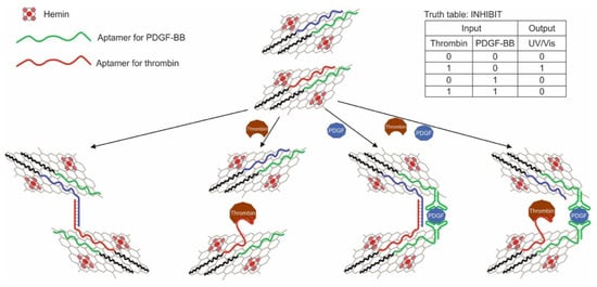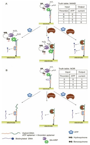 - Chen, J.; Zeng, L. Enzyme-amplified electronic logic gates based on split/intactaptamers. Biosens. Bioelectron. 2013, 42, 93–99. [Google Scholar] [CrossRef] [PubMed]