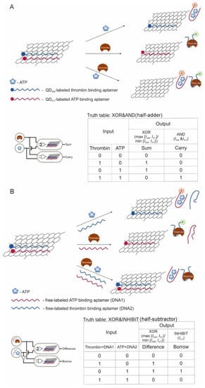 Another publication describes XOR logic based on AuNPs in homogeneous solution and on a single-nanoparticle level using total internal reflection fluorescence (TIRF) microscopy [75]. This system consisted of 13 nm AuNPs, which were functionalized by ssDNAs with Cy5 labels. AuNPs quench fluorescence on a certain distance from fluorophore due to the FRET [74]. One AuNP was modified with ssDNA in a hairpin shape and adenosine aptamer, which contained a complimentary sequence on the terminus removed from the nanoparticle’s surface. Thus, ssDNA fluorescence was quenched from the start, and the aptamer label fluorescence was not quenched [90,91]. In addition to that, nanoparticles were covered by “helper” DNA (T10) for stabilization. Adenosine and complimentary ssDNA were used as input data. Adenosine addition led to structural changes in the aptamer, and Cy5 label came close to a nanoparticle surface, triggering fluorescence quenching. Addition of ssDNA complimentary to hairpin ssDNA caused straightening of the hairpin and removal of Cy5 label from the surface, thus restoring its fluorescence. The fluorescent output signal was considered “1” if the signal change was more than 5% from the base value and “0” if the change was less than 5%. As dissociation constants for aptamer (6 µM [47]) and complimentary DNA (nM range [92]) were considerably different, optimal concentration values were needed to be found for XOR logic construction: each target gives a “1” signal, together they give a “0” signal. The molar ratio of adenosine/complimentary DNA was 5000:1 (250 µM versus 50 nM). It should be noted that introduction of a sequence complimentary to aptamer provided better target binding, as the binding domain was removed from the nanoparticle’s surface in this case [93].