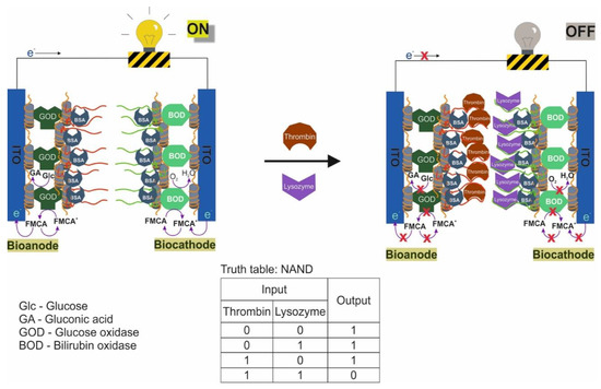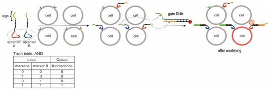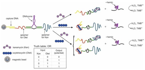 For example, an AND gate has two inputs, A and B; output signal 1 only occurs when A and B are present together (1, 1); the presence of only A (1, 0) or B (0, 1) does not lead to the occurrence of the output signal, which is taken as 0. For the logic gate OR, the output signal 1 is formed when there is one A (1, 0), one B (0, 1), or both A and B (1, 1) in the system. The output of the logic gate XOR is assumed to be 1 when A (1, 0) or B (0, 1) are present, but not when both are present. Other basic logic gates can be interpreted in the same way. In this case, under the conditions of aptameric bio-computing, biomolecules (for example, targets) act as A and B, and optical (fluorescent, colorimetric) or electrochemical signals as an output signal. In the case of an output signal, a threshold value is set, above which the signal is taken as 1, and below it as 0. Thus, the measurement results are simplified: either “yes” or “no”, or analytes in the samples are “present” or “not present”.