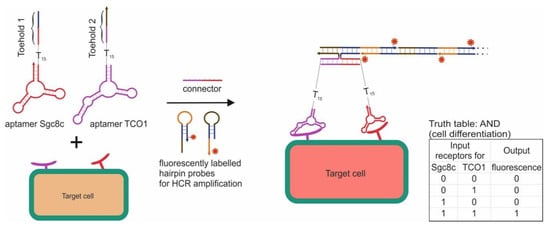 - Cascade: the cascade effect is realized when the reactions occurring in the system are interconnected. The products of one reaction initiate the start of a new reaction. Examples of a cascade in aptameric logic can be found in [32,34,35,40,57,58];