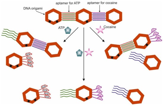 - Wu, N.; Willner, I. Programmed Dissociation of Dimer and Trimer Origami Structures by Aptamer-Ligand Complexes. Nanoscale 2017, 9, 1416–1422. [Google Scholar] [CrossRef]
