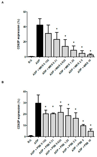 Effects of MRS2500 (MRS) (A) and PSB0739 (PSB) (B), (0.155–10 μmol·L−1) on the magnitude of expression of CD62P on platelets activated with ADP (100 µmol·L−1). The results are expressed as the mean% activated platelets ± SDs. * p < 0.05–p < 0.001 for comparison with the drug-free control system. BG = unstimulated platelets (n = 4–6 individual donors with 4–8 experiments in each series).