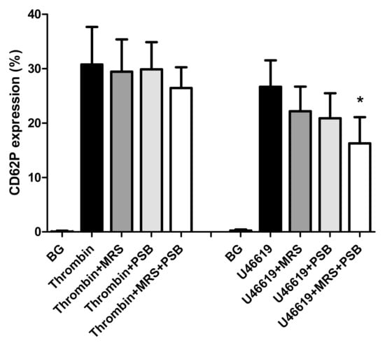 These results are shown in Figure 2. Activation of platelets with thrombin resulted in significant upregulation of expression of CD62P, which was not affected by pre-treatment of the cells with either MRS2500 or PSB0739 individually (10 µmol·L−1), although slight, statistically non-significant inhibition (14%), was noted in the case of the combination of receptor antagonists. In the case of platelets activated with U46619, pre-treatment of the cells with MRS2500 and PSB0739 individually and in combination resulted in 16.8% (p < 0.1), 21.6% (p < 0.053), and 39% (p < 0.004) inhibition, respectively. The observed lack of effect of MRS2500 and PSB0739 individually on expression of CD62P by thrombin-activated platelets revealed in this series of experiments appears to exclude cytotoxic effects of these agents on platelets. Moreover, the decreased expression of CD62P detected following the activation of MRS2500- or PSB0739-treated platelets with U46619, individually and especially in combination, as well as thrombin-activated cells in the presence of both agents, is seemingly consistent with attenuation of secondary autocrine stimulation due to release of endogenous ADP.