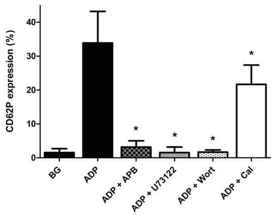 2.4. Effects of 2-APB, Calmidazolium Chloride, U73122 and Wortmannin on Expression of CD62P by ADP-Activated Platelets