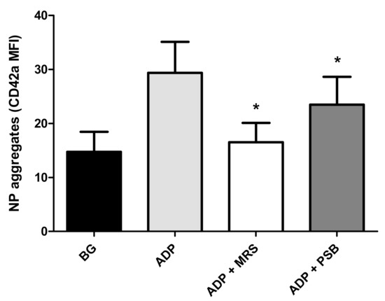 Effects of MRS2500 (MRS) and PSB0739 (PSB) both at 10 µmol·L−1 on the formation of NP heterotypic aggregates following addition of ADP (100 µmol·L−1). The results are expressed as the mean fluorescence intensity (MFI) of CD42a-PE emitted by CD16+/CD45+ neutrophils. * p < 0.05–p < 0.0002 for comparison with the drug-free control system. BG = unstimulated platelets (n = 5 individual donors with 9–17 experiments in the series).