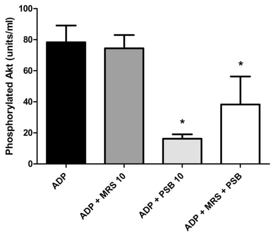 Platelets (approximately 1 × 108 mL−1) suspended in HBSS were pre-incubated with MRS2500 or PSB0739 (10 µg·mL−1) individually or in combination for 10 min at 37 °C followed by addition of ADP (100 µmol·L−1). After 3 min of incubation [55,56,57], the reactions were terminated and the platelets lysed by addition of an equal volume of cell extraction buffer supplemented with a 1% protease and phosphatase inhibitor cocktail (all purchased from Invitrogen, ThermoFisher Scientific, Carlsbad, CA, USA) and held on ice for 30 min. Thereafter, the cell extracts were centrifuged at 12,000× g for 10 min and the supernatants decanted and stored at −80 °C until analysis of phosphorylated Akt1 using an ultrasensitive solid-phase sandwich ELISA system that detects phosphorylation of serine residue 473 on Akt1 (ThermoFisher Scientific). The results of five experiments using platelets from three separate donors are expressed as units phosphorylated Akt1·mL−1.