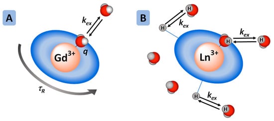 (A) Principal microscopic parameters that influence the relaxivity of Gd3+-based contrast agents. (B) ParaCEST Ln3+ complex: the ParaCEST effect originates from proton exchange between the bulk water and protons on the ligand or on the coordinated water molecules.