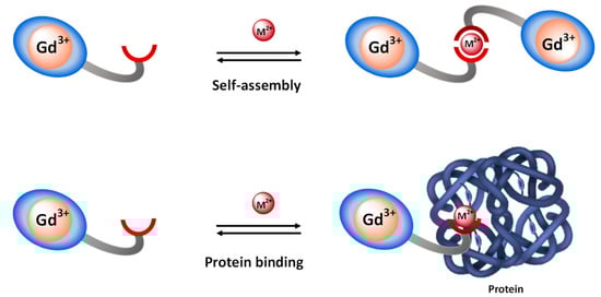 The principle of detection by MRI is based on the modification of microscopic parameters influencing the efficiency of a contrast agent upon cation interaction. Since the chemist is able to predict a τR or q modification by careful design of the contrast agent, cation detection by MRI is mainly based on the modification of these two parameters. For detection through τR modulation, probes often undergo an increase in molecular weight and/or rigidity upon cation interaction, which results in an increase in τR and hence an increase in relaxivity, r1. Such increases in molecular weight usually occur due to self-assembly induced by the cation (M2+) or protein binding (Figure 3). The effect of τR is greater at intermediate fields (20–60 MHz), making the response more efficient in this field-range.