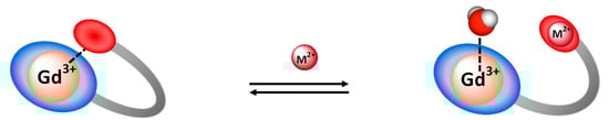 The design of contrast agents based on q-modulation focuses on the re-arrangement of the Gd3+ coordination environment upon cation interaction. A coordinating function should switch from Gd3+ to the cation (M2+), allowing for one (or more) water molecules to enter the first Gd3+ coordination sphere (Figure 4). This results in an increase in relaxivity. This “flipping mechanism” is not easy to predict as it will depend on the cation (M2+), the Gd3+ coordinating unit, the M2+ coordinating unit, and on the linker. The challenge is also to design a stable Gd3+ probe with or without the presence of the cation (M2+). A modification of q can also be expected when the cation detection occurs next to the Gd3+ coordination sphere and hinders the presence of the water molecule due to steric constraints. This results in decreasing relaxivity, causing the system to switch OFF.