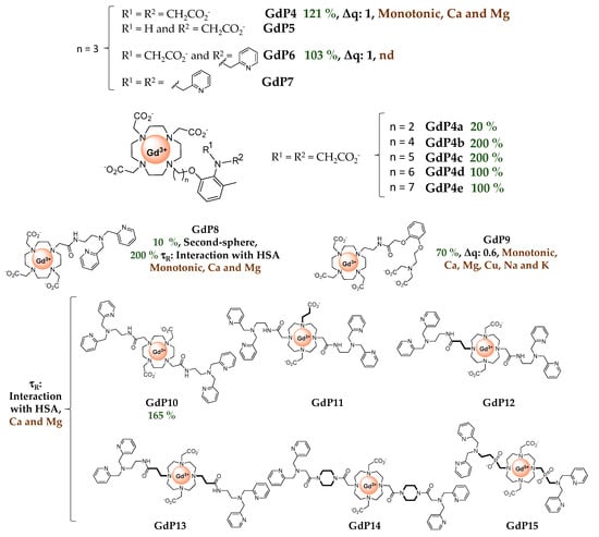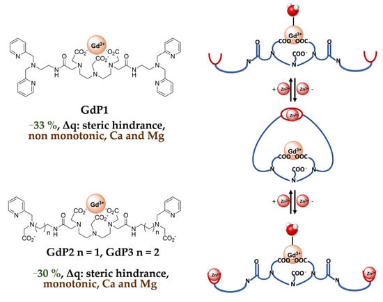 The Zn2+ binding affinity is a crucial parameter as it should be high enough to detect signal changes, but not too high to cause depletion of Zn2+ in the body. Ideally, the affinity should be in the same range as the local concentration being detected, with interest now on developing systems with different Zn2+ affinities in order to explore different Zn2+ concentrations. Although the determination methods are different, some general rules can be seen with the systems previously described. When the Zn2+ binding unit is based on an iminodiacetate, the affinity for Zn2+ is around Log KZn = 3.5–4 (KD ≈ 0.1 mM), and when it is a derivative of DPA modified with carboxylate function, Log KZn = 7–8 (KD ≈ 10–100 nM) []. When the DPA is modified by the addition of a carbon atom (GdP20), lower affinities are obtained with Log KZn = 5.6 (KD ≈ 2 µM) []. Other binding units with different affinities have also been explored, including pyrazoline groups (GdP21) with Log KZn = 3 (KD ≈ 400 µM), quinoline (GdP22–24) with Log KZn = 5–6 (KD ≈ µM), or macrocyclic NO2A (GdP25) with a very high affinity for Zn2+ (Log KZn ≈ 17) [].