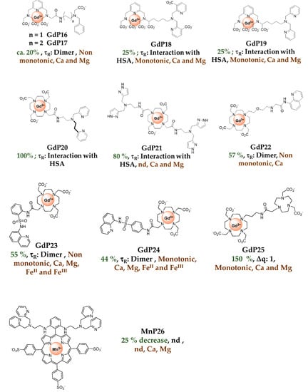 It should be mentioned that outside Ln3+ probes, a porphyrinic Mn3+ contrast agent MnP26 (Figure 6) has also been developed for Zn2+ detection []. It is a dual fluorescence and MRI probe, where the fluorescence is switched on upon Zn2+ addition, while the relaxivity surprisingly decreases by ca. 25%.