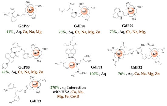 As for Zn2+, an amidoquinoline moiety was proposed for Cu2+ detection, GdP29 (Figure 7), and a relaxivity enhancement of ca. 70% was observed linked to an increase in the q-value from 1 to 2. This relaxivity increase is partially lost in the presence of physiological anions such as phosphate, carbonate and citrate, due to the replacement of water molecules on the DO3A moiety in the presence of Cu2+ []. Zn2+ selectivity is also not totally convincing as a response is observed in the presence of 10-fold excess of Zn2+.