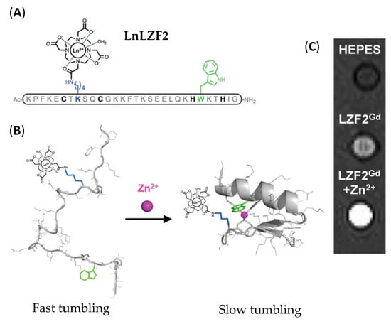 Bioinspired zinc finger peptide and principle for zinc detection by Magnetic resonance imaging (MRI): (A) Structure of bioinspired zinc-finger peptide LnLZF2; (B) Representation of the folding of LnLZF2 upon Zn2+ binding; (C) T1-weighted MR images of phantoms containing Zn-free ad Zn-loaded GdLZF2 at 1.5 T. Adapted with permission from Ref []; published by The Royal Society of Chemistry, 2018.
