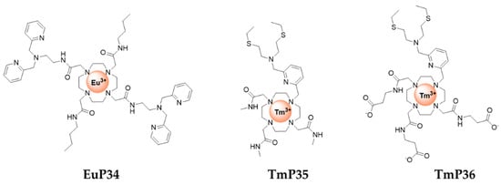 More recently, TmP35 and TmP36 (Figure 9) were proposed as ON/OFF responsive ParaCEST MRI contrast agents for zinc and copper detection []. The ParaCEST effect originates from the amide proton and is switched OFF upon Zn2+, Cu+ or Cu2+ binding. The formation of TmP/Zn 2/1 complex, TmP/Cu 2/1 complex for Cu2+ and 1/1 complex for Cu+ is responsible for the faster exchange of amide protons and disappearance of the CEST signal. Obviously, the selectivity of the system is poor and the switch OFF CEST signal remains a difficulty for any practical application.