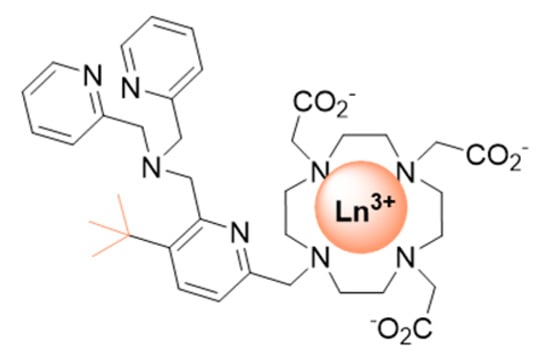 Very recently in a proof of concept study, LnP37 (Figure 10) was proposed to signal changes in Zn2+ concentrations by chemical shift modification and luminescent emission changes []. The tert-butyl group serves as the parashift reporter. The complex has no coordinated water molecule in the absence of Zn2+ (as demonstrated by luminescence lifetime measurements of the Eu3+ and Tb3+ complexes) and becomes monohydrated upon Zn2+ coordination. The emission spectra of EuP37 is greatly affected upon Zn2+ coordination, confirming important modification in the Eu3+ coordination sphere. TbP37, DyP37, and TmP37 have paramagnetically shifted tert-butyl proton resonances of −30.2 ppm, −36.5 ppm, and +17 ppm, respectively. The addition of Zn2+ resulted in the appearance of new tert-butyl peaks. The relaxation rates of those are greatly decreased, which is probably the result of an increased distance between the tert-butyl protons and the paramagnetic center.