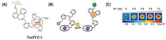 In the past few years, there has been renewed interest in heteronuclear MRI, particularly 19F MRI. 19F is the most promising imaging nucleus due to the natural abundance of 19F with spin 1/2, and the negligible presence of endogenous signals, since only a trace amount of 19F are present in the body. However, low doses of fluorinated agents and the low efficiency of T1 lead to long acquisition times, and the sensitivity of 19F MRI may be a problem. The use of dual-modality probes and large molecules with high fluorine content have been explored to mitigate these issues. Many 19F probes have been developed, including organic molecules, metal complexes, or nanoparticles []. Responsive paramagnetic complexes have also flourished, particularly based on transition metal ions for redox or pH sensing []. Recently, a Tm3+ complex, TmPFZ-1 bearing nine fluorine atoms on the DPA moiety was developed by Que et al. (Figure 11) []. In the absence of Zn2+, the system is highly flexible and the probe is not detectable by 19F MRI. Upon Zn2+ coordination, a rigidification of the system is observed and one major, accompanied by three minor, 19F NMR signals appear. These correspond to different diastereoisomers of the probe. Zn2+ could be detected with 19F MRI, with a detection limit of 180 µM in vitro.