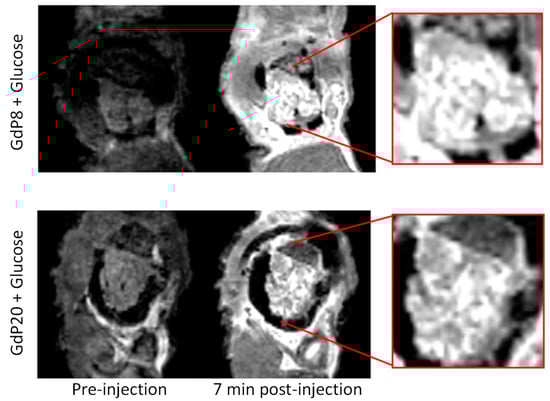 Given the high concentration of Zn2+ in the pancreas, and the easier access (no crossing of the blood–brain barrier is necessary), this organ has also been imaged with Zn2+ responsive probes. This was the case with GdP22 (Figure 6), which was demonstrated to be cell-permeable, and non-toxic (on MIN6 and HEK 293 cells). In vivo MR images were acquired on healthy C57/BL6 mice after injection of 0.1 mmol kg−1 of GdP22 and show uptake of the agent in the pancreas, likely reflecting the accumulation of the agent where free Zn2+ is present []. The most important in vivo work on Zn2+ detection was certainly performed by Sherry and coworkers using GdP10 (Figure 6). First, this probe has been used in vivo on mice to image β-cells from the pancreas. Conversely to the previous example, in this case, a glucose stimulation was used to release Zn2+ from the β-cells together with insulin. They showed that a greater contrast was observed: (1) upon glucose stimulation compared to saline injection; (2) after glucose stimulation on a 24-week old mouse with twelve weeks of a high-fat diet compared to a low-fat diet; (3) after glucose stimulation on normal mice rather than STZ treated mice (model of type I diabetes), where STZ (streptozotocin) is a toxin for β-cells []. As GdP12 was found to be optimized in vitro compared to GdP10, images of mice pancreas after glucose stimulation were compared in the presence of GdP10 and GdP12. However, no significant differences in contrast enhancement had been observed. This could be explained by the difficulty in the selection of the ROI (region of interest) of the pancreas given the fact that it is not a solid organ, and/or by the field of detection, which is 0.5 T in vitro and 9.4 T in vivo []. Recently, it was demonstrated that the use of lower-affinity zinc sensors, such as GdP20 (Figure 6), improved the imaging of Zn2+ from mouse pancreas []. Indeed, they compared images obtained after glucose stimulation from mouse pancreas with GdP20 and GdP8, using an MR-compatible window to hold the pancreas in place. The two agents have an affinity for Zn2+ of Log KZn = 5.6 and 6.9, respectively, while the affinity of Zn2+ for HSA is Log KZn = 7.5. Upon glucose stimulation, a non-uniform signal enhancement was shown across the pancreas with “hot spots” (which could correspond to first-responder islets) which were evidenced more easily using GdP20 (Figure 12). This was attributed to an important “background signal” using GdP8. The change in intensity upon injection of the contrast agent is nearly two times more important with GdP8 compared to GdP20 without glucose stimulation. Model binding predictions confirmed these experimental findings.
