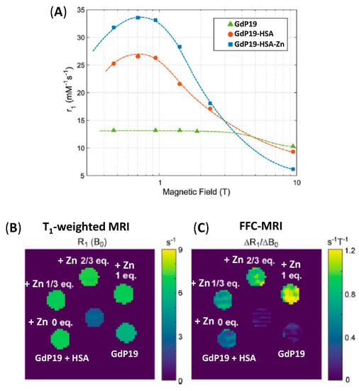 - Bodenler, M.; Malikidogo, K.P.; Morfin, J.F.; Aigner, C.S.; Toth, E.; Bonnet, C.S.; Scharfetter, H. High-field detection of biomarkers with fast field-cycling MRI: The example of zinc sensing. Chem. Eur. J. 2019, 25, 8236–8239. [Google Scholar] [CrossRef] [PubMed]
