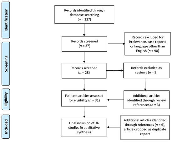The search string described in the Materials and Methods section returned 127 manuscripts; 90 of those were either related to different disciplines or targeted other conditions or didn’t fit the inclusion criteria and were dropped. Nine of the remaining were review papers and not included in the study, although their references were screened for additional sources revealing three additional manuscripts. This brought the total number of selected papers to thirty-one, that were downloaded and assessed for their eligibility. Following further reference screening on those papers, six more were assessed while a paper that duplicated findings from the same study was rejected. The final selection of thirty-six papers that were included in the study was made independently by both authors and the decisions coincided. Figure 2 presents the selection process flowchart, according to PRISMA guidelines [26].