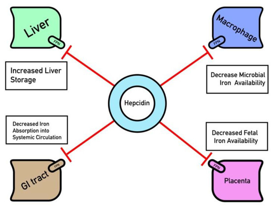 Currently, clinical studies of hepcidin agonists primarily center around the use of direct hepcidin formulations, although their uses are currently limited to iron overload induced by hereditary hemochromatosis and beta-thalassemia [153]. However, natural hepcidin is limited by its short half-life, several synthetic methods of mini-hepcidin are aiming to increase the half and therefore the beneficial therapeutic effects similar to the role of hepcidin [160,161,162]. These mini-hepcidins consist of a short chain of amino acids that mimic the N-terminal region, the ferroportin binding region [153]. To date, no preclinical studies of mini-hepcidins have a women-centric health focus, although hepcidin is thought to function heavily in antibacterial defense of the urinary tract [153,163]. However, it is currently unknown if potential hepcidin agonism can be used to aid host defenses, especially in women with recurrent UTIs. Furthermore, obstetric disorders where there is evidence of iron overload, such as gestational diabetes mellitus, may also benefit from the utilization of these therapies, although they suffer from many of the same limitations regarding teratogenicity as their antagonistic counterparts. Similarly, hepcidin agonists may also be useful prior to the onset of preeclampsia as iron overload is thought to be central to pathogenesis; however, women remain asymptomatic during the early stages, and after the onset of symptoms, hepcidin is upregulated. Therefore, until a way to screen for the disease is developed, hepcidin agonists may be limited for this purpose. Although clinical studies have yet to define the exact role of hepcidin agonism within women’s health, the potential for uses of hepcidin agonists appears to be more limited than that of hepcidin antagonists, as low iron availability, excess iron storage, or reduced placental transfer of iron appear to be implicated.