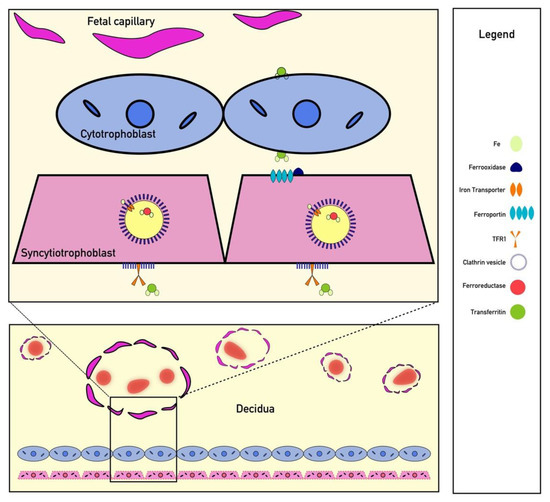 Iron is a critically important micronutrient for proper fetal development; however, iron cannot easily diffuse through the placenta to reach the fetus [68]. Additionally, the fetus cannot create its own iron and must receive all of its iron from the material circulation [69]. Circulating iron is often bound to transferrin, and transferrin-bound iron uptake appears to be necessary for fetal development [69]. One study of iron transport found that embryos of transferrin receptor-1 (TfR1) knockouts were not compatible with life due to severe anemia [69,70]. Once transferrin-bound iron binds to TfR1 on syncytiotrophoblasts, clathrin-mediated endocytosis occurs, and iron is released from transferrin within the acidified endosome [71] (Figure 2). From there, iron is reduced from Fe+3 to Fe+2 via ferrireductase and exported into the cytoplasm via DMT-1 or ZRT/IRT-like protein (ZIP) before being bound to an iron chaperone for transport to ferroportin, which faces the fetal basal lamina connective tissue [69]. Iron transport across the placenta results in iron binding to fetal transferrin, although the mechanism by which iron is transported from the basal lamina connective tissue into the fetal circulation remains under study [69]. Other mechanisms related to non-transferrin bound iron (NTBI) placental transport have been proposed, but their significance in placental development is currently unknown [69]. Importantly, NTBI appears only in iron overloaded patients with significantly elevated transferrin saturation and is unlikely to play a significant role in physiological placental iron transfer [69,72]. Recently published evidence suggests that hepcidin also functions within the placenta to downregulate ferroportin and TfR1 expression [42]. Therefore, systemic conditions that affect hepcidin concentrations should also be assumed to modulate iron transfer to the fetus in a similar mechanism to other tissues. However, more preclinical research is needed to directly prove that hepcidin is the direct cause of iron dysregulation noted in many of the observational clinical studies discussed elsewhere.