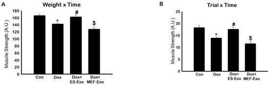 To further validate this data we also measured trial x time to evaluate muscle function. A significant (p < 0.05) reduction in muscle function was observed in Dox-treated animals as compared with controls (Figure 1B). Treatment with ES-Exos significantly improved muscle function as evaluated by weight x time and trial x time methods (p < 0.05, Figure 1A,B). Importantly, to understand the differential effect of ES-Exos, we used MEF-Exos, which contain different cellular components compared with ES-Exos. There was no significant improvement following MEF-Exos treatment, suggesting that ES-Exos have different cellular protective components, which improve muscle function.