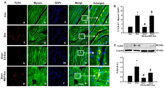 Treatment with ES-Exos inhibits TLR4 activation in soleus muscle. (A) Representative photomicrographs of soleus muscle sections stained with myosin and inflammasome marker TLR4. Each box shows TLR4+ cells in red (a,f,k,p), myocytes in green (b,g,l,q), DAPI in blue (c,h,m,r), merged images (d,i,n,s), and enlarged areas of merged images (e,j,o,t). (B) Histograms from quantitative analysis of TLR4+ cells over total DAPI. (C) Representative blot and densitometric analysis of TLR4. Error bars = mean ± S.E.M. * p < 0.05 vs. control, # p < 0.05 vs. Dox, $ p = non-significant vs. Dox, one-way ANOVA followed by Tukey test; western blot quantities are represented as A.U. Scale bar = 100 µm, n = 14–16, male and female (B) and n = 6–8, male and female (C). Images taken at 40× magnification.