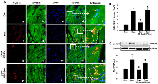 ES-Exos treatment of mice inhibits NLRP3 inflammasome formation in the soleus muscle after Dox administration. (A) Representative photomicrographs of soleus muscle sections stained with myosin and inflammasome marker NLRP3. Each box shows NLRP3+ cells in red (a,f,k,p), myocytes in green (b,g,l,q), DAPI in blue (c,h,m,r), merged images (d,i,n,s), and enlarged areas of merged images (e,j,o,t). (B) Histograms from quantitative analysis of NLRP3+ cells over total DAPI. (C) Representative blot and densitometric analysis of NLRP3. Error bars = mean ± S.E.M. * p < 0.05 vs. control, # p < 0.05 vs. Dox, $ p = non-significant vs. Dox, one-way ANOVA followed by Tukey test; western blot quantities are represented as A.U. Scale bar = 100 µm, n = 14–16, male and female (B) and n = 6–8, male and female (C). Images taken at 40× magnification.