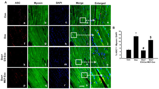 Treatment with ES-Exos inhibits adapter protein, ASC, after Dox administration. (A) Representative photomicrographs of soleus muscle sections stained with myosin and adapter protein, ASC. Each box shows ASC+ cells in red (a,f,k,p), myocytes in green (b,g,l,q), DAPI in blue (c,h,m,r), merged images (d,i,n,s), and enlarged areas of merged images (e,j,o,t). (B) Histograms from quantitative analysis of ASC+ cells over total DAPI. Error bars = mean ± S.E.M. * p < 0.05 vs. control, # p < 0.05 vs. Dox, $ p = non-significant vs. Dox, one-way ANOVA followed by Tukey test; Scale bar = 100 µm, n = 14–16, male and female. Images taken at 40× magnification.